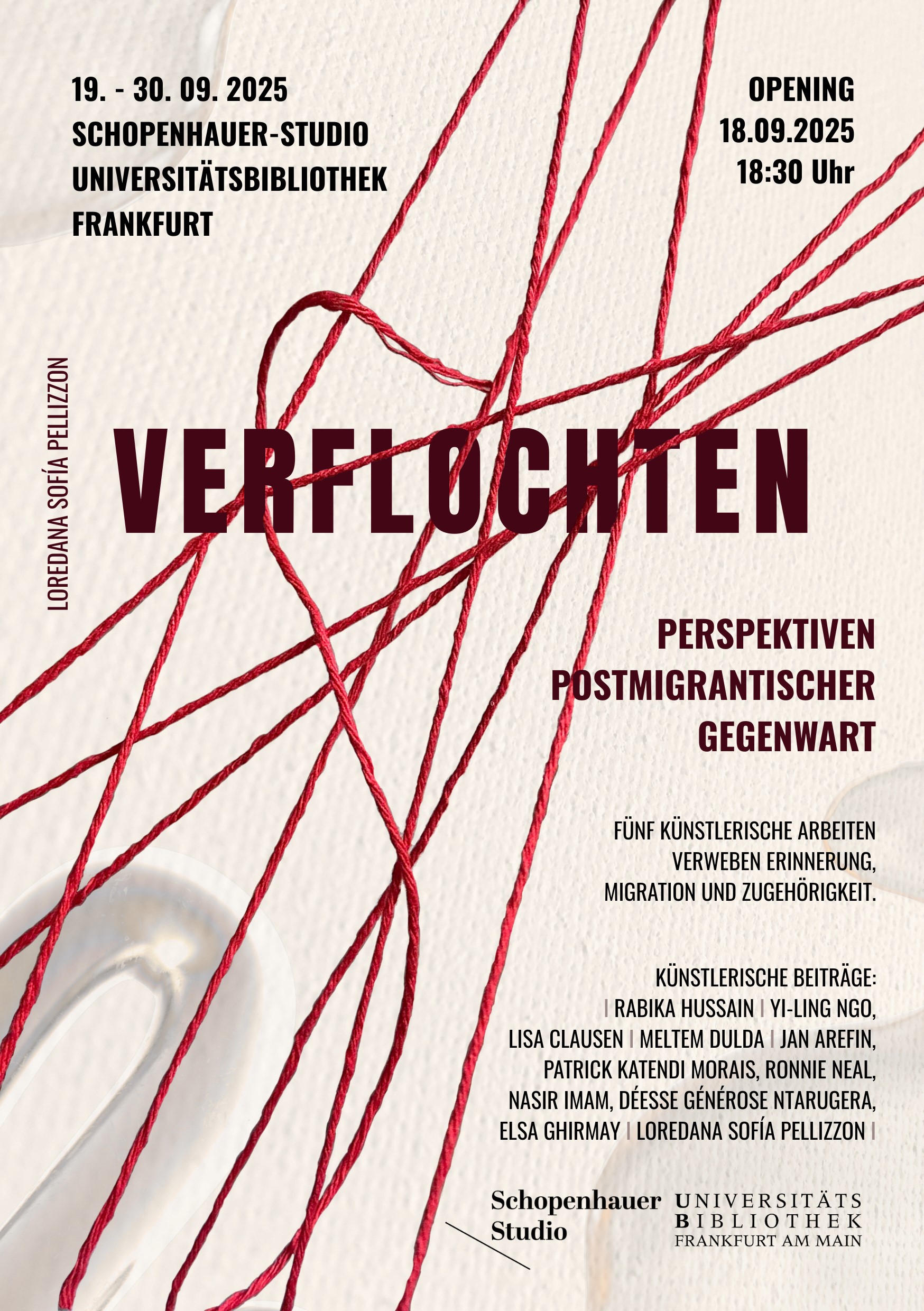 In Verflochten verweben fünf künstlerische Arbeiten aus Frankfurt am Main persönliche Migrationserfahrungen mit individuellen Ausdrucksformen: Drahtmasken, Leinwand, Klang, Objekte und Film. Sie sind das Ergebnis einer künstlerisch-forschenden Annäherung an Erinnerung, Identität und das Spannungsfeld zwischen Verortung und Bewegung. In Gesprächen, gestalterischen Prozessen und kollaborativen Momenten wurden intime Geschichten in künstlerische Formen übersetzt. Verflochten ist mehrstimmig, hybrid, gemeinschaftlich – ein Raum, in dem Verbindungen sichtbar werden.