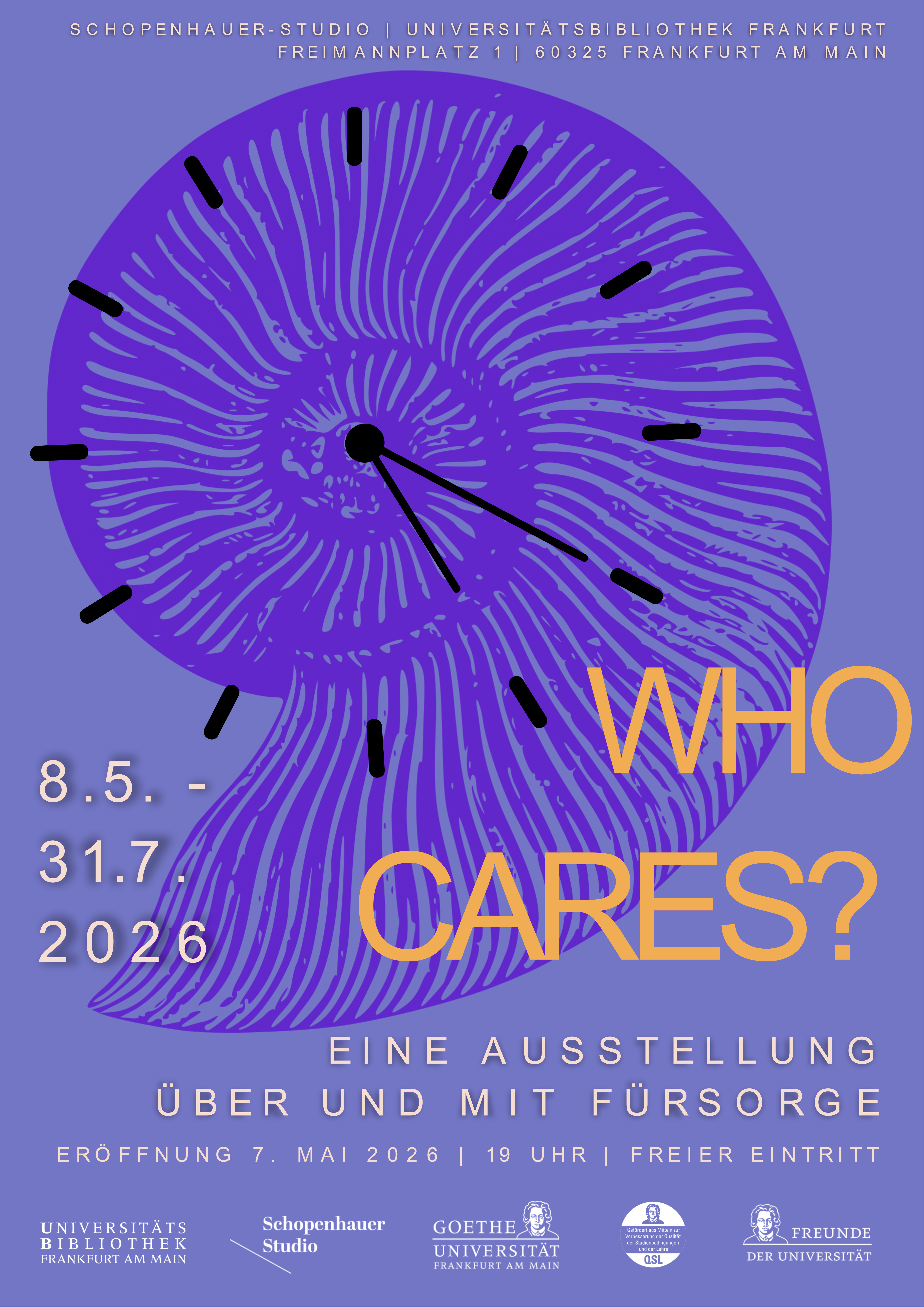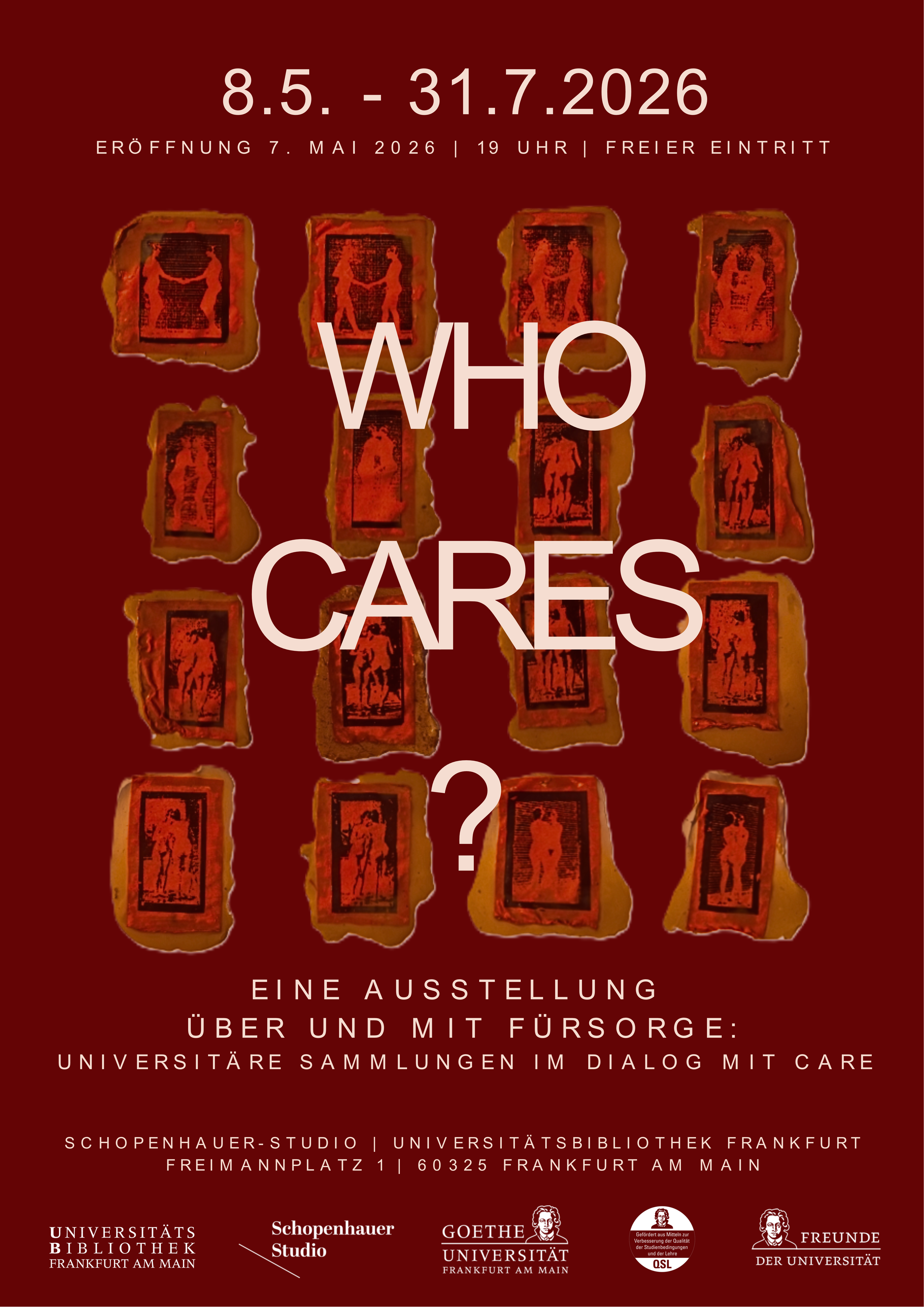 Förderer und Kooperationspartner: WHO CARES? ist ein Kooperationsprojekt des Arbeitsbereichs Visuelle Kultur am Institut für Kunstpädagogik und des Schopenhauer-Studios in Zusammenarbeit mit Studierenden der Goethe-Universität Frankfurt. Konzipiert wurde die Ausstellung vom Lehr- und Forschungsseminar TAKE CARE, das über drei Semester hinweg stattfand. Das Projekt wurde von der Goethe-Universität gefördert und verbindet Forschung, Lehre sowie künstlerische Praxis miteinander.