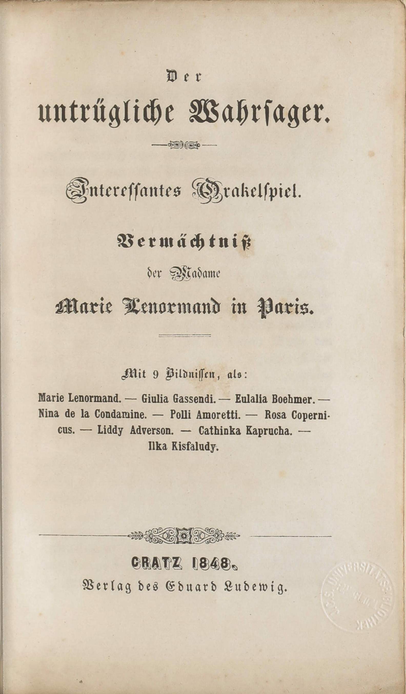 Der untrügliche Wahrsager : interessantes Orakelspiel : Vermächtniß der Madame Marie Lenormand in Paris : mit 9 Bildnissen, als: Marie Lenormand, Giulia Gassendi, Eulalia Boehmer, Nine de la Condamine, Polli Amoretti, Rosa Copernicus, Liddy Adverson, Cathinka Kaprucha, Ilka Kisfaludy : Zweite verschönerte Auflage : Cratz : Verlag des Eduard Ludewig, 1848. – 32 S., 9 ungezählte Bl. Tafeln : Illustrationen